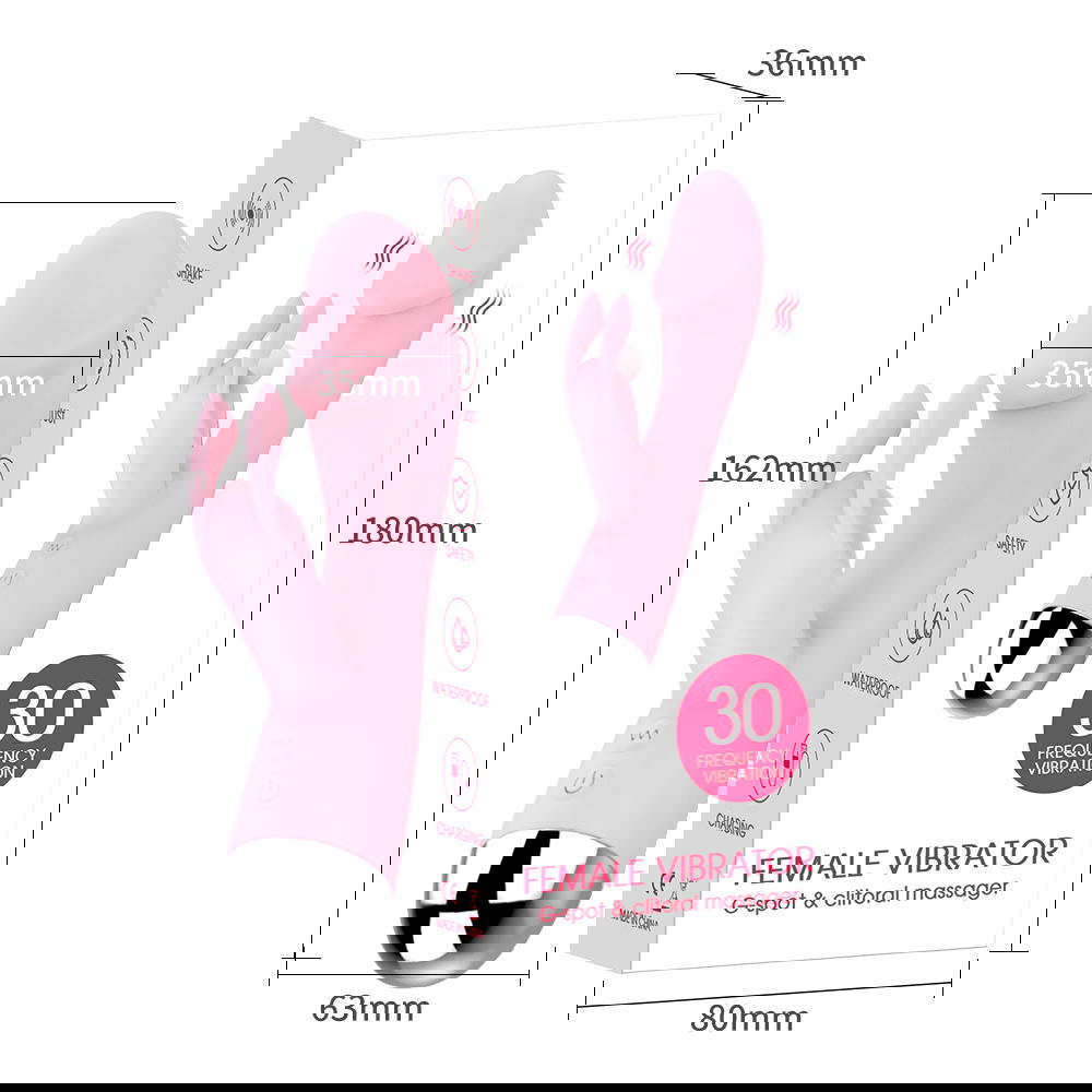 Vibrador de punto G de conejo recargable con 30 modos de vibración. Vibrador diseñado para proporcionar doble estimulación, con masaje de clítoris y penetración vaginal simultáneamente. Su diseño presenta un glande ligeramente curvado, flexible y protuberante, reproduciendo la forma de un pene humano. Mientras que el extremo más grande del vibrador ofrece el máximo placer durante la penetración vaginal, el extremo más pequeño, flexible y con forma de conejo intensifica la excitación al masajear el clítoris. El vibrador dispone de dos potentes motores vibratorios, uno en cada extremo, proporcionando una estimulación intensa y placentera. Producto recargable, viene con cable USB. Peso: 90 g. Medidas aproximadas: 16,2x5,5x3,4 cm. Penetrable. Silicona+ABS.
