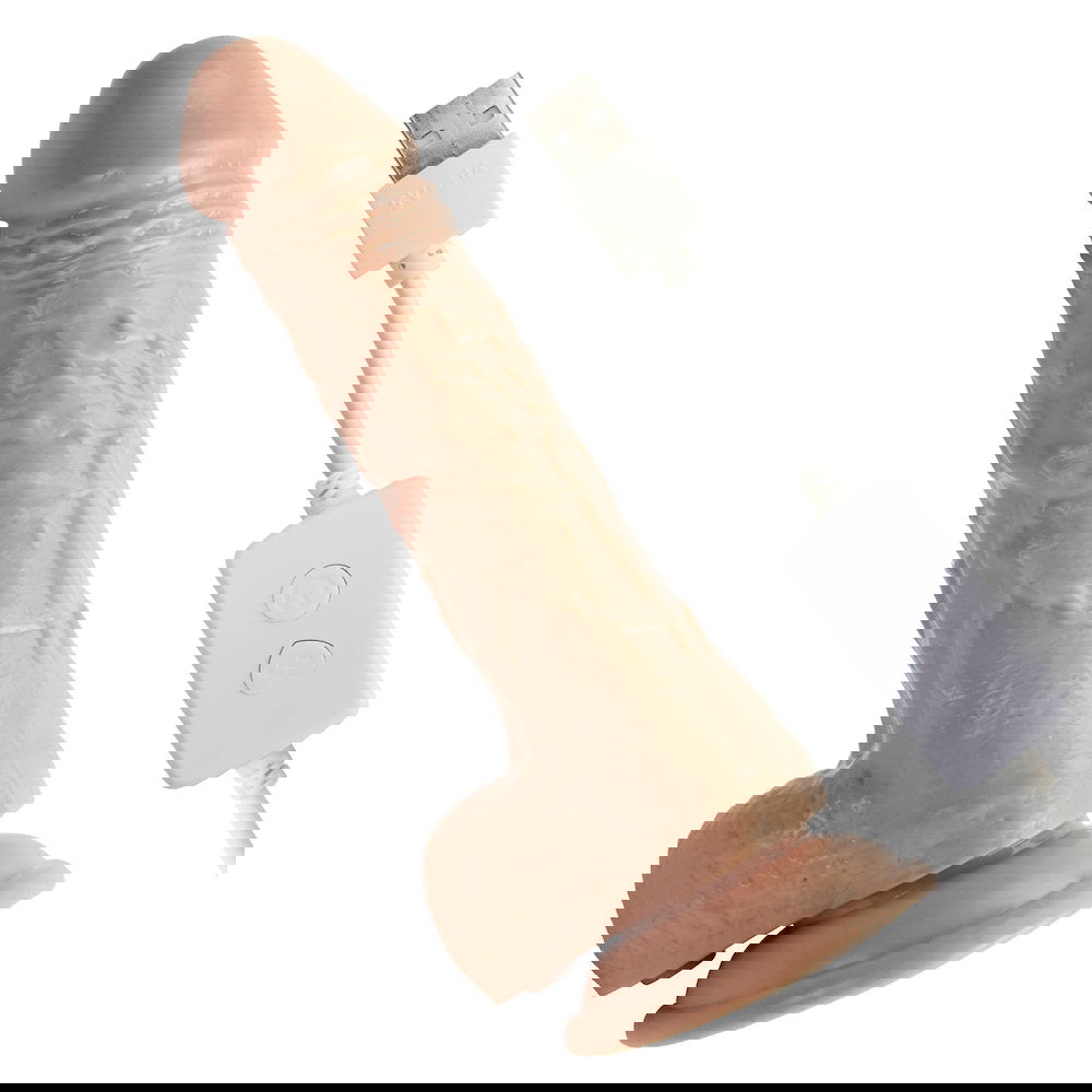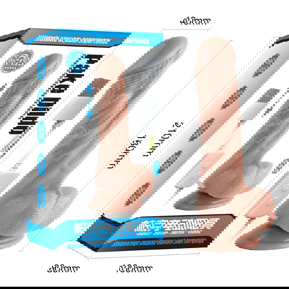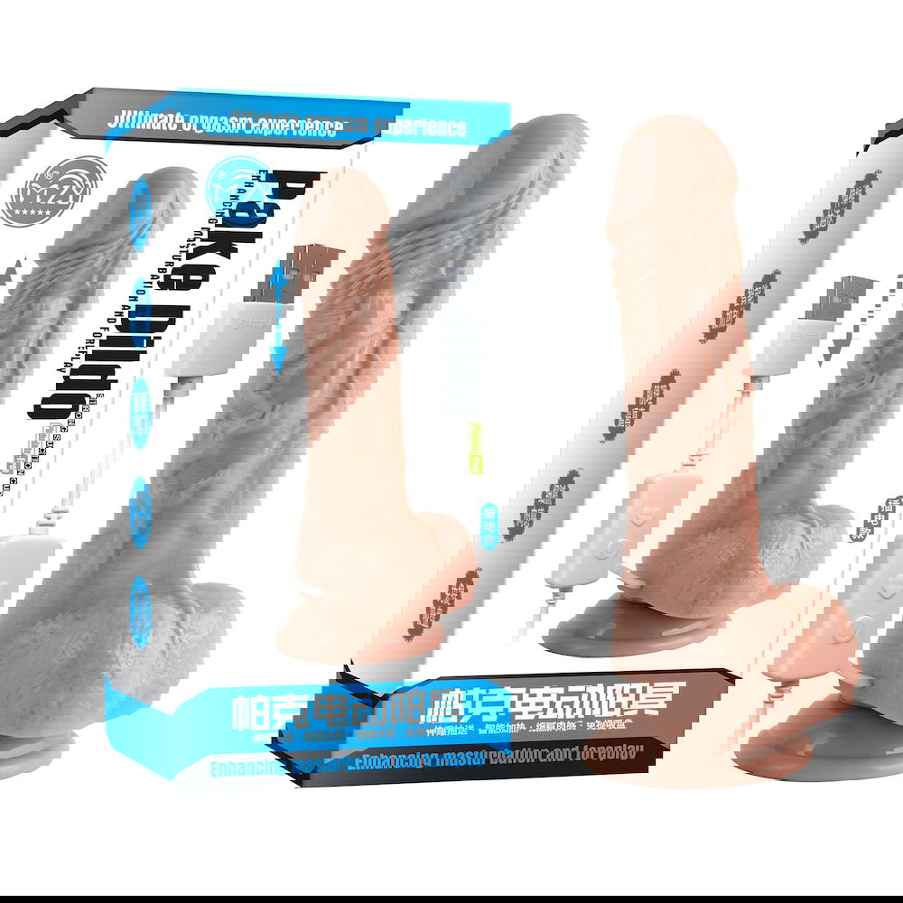 Prótesis con 7 modos de ida y vuelta, tiene función de calentamiento. Forma de pene realista, con testículos, aportando mayor placer. No recargable, funciona directamente conectado a la toma de corriente, mediante cable USB. Medidas: 18x4cm. Peso: 250 g. Medidas de penetración: 14cm. Material: TPE + ABS.