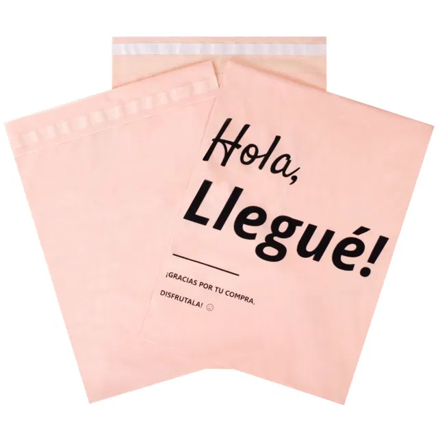 Bolsa ecommerce monocapa estampada sobre una de sus caras con el diseño Hola! Llegué + frase + iconos (imagen a modo de referencia), apta para envío por correo, con adhesivo inviolable. Usos y capacidad: telefonía, accesorios, lencería o similar.