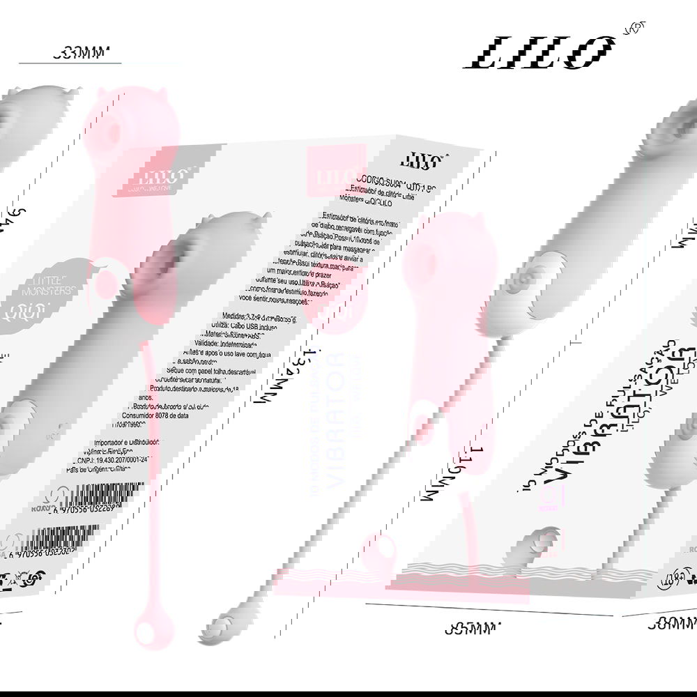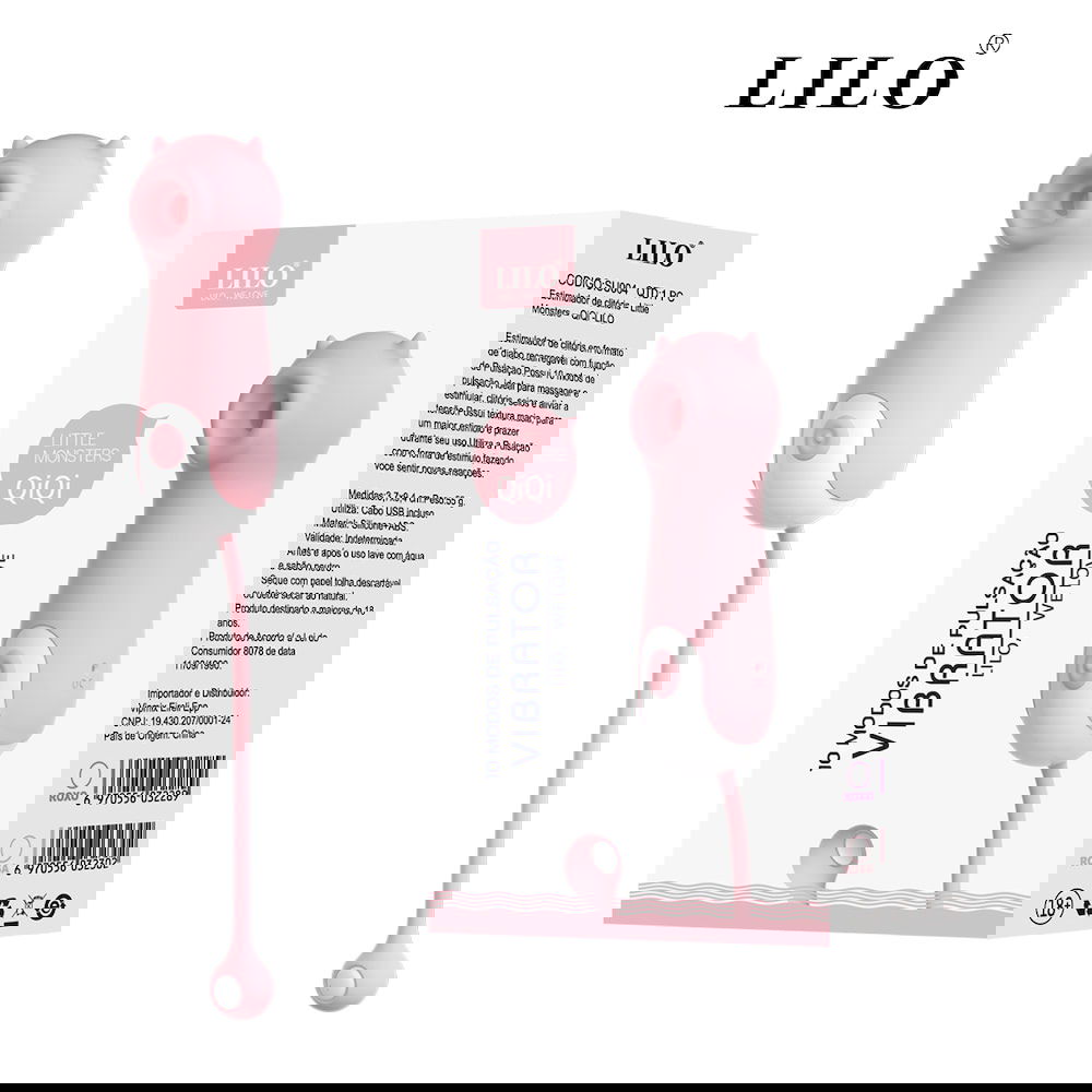 Estimulador de Clítoris – Little Monsters – QiQi -LILO. Estimulador de clítoris recargable con forma de diablito y función de pulsación. Cuenta con 10 modos de pulsación, ideales para masajear y estimular el clítoris y los senos, además de aliviar la tensión. Su textura suave proporciona mayor estimulación y placer durante su uso. Utiliza la pulsación como forma de estimulación, lo que te permite experimentar nuevas sensaciones. Medidas: 3,7 x 9,4 cm. Peso: 55 g. Usos: Incluye cable USB. Material: Silicona + ABS.